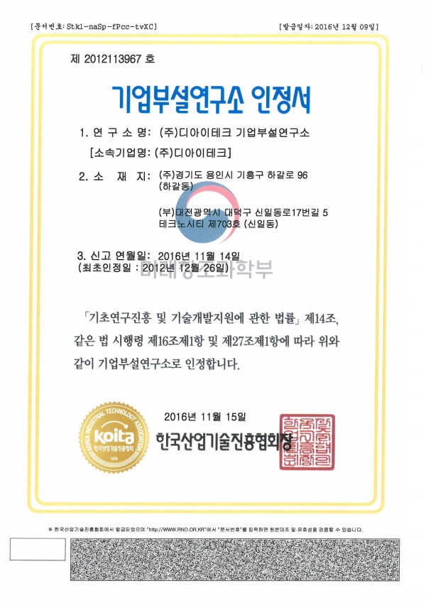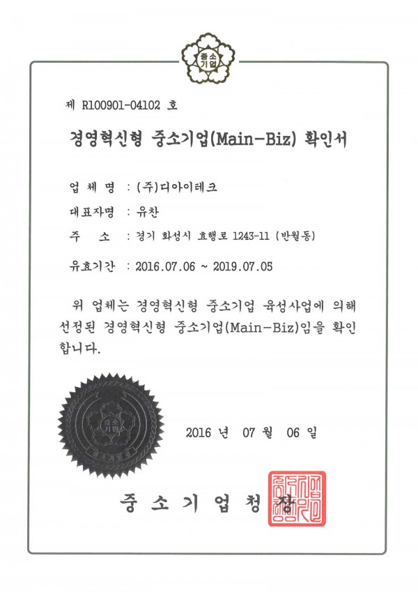 디아이테크는 품질과 신뢰를 최우선으로 하여 국내외 다양한 인증을 취득하고 있습니다.